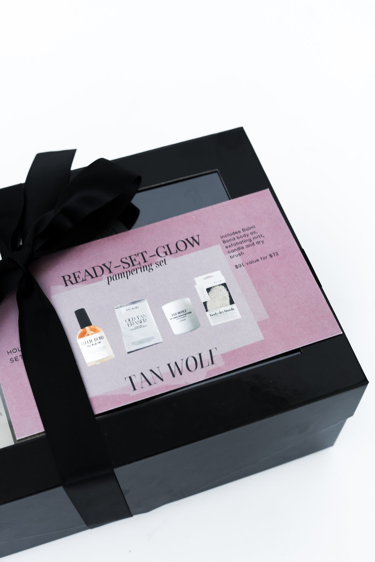 Includes: exfoliating tan eraser mitt, dry brush, candle and body oil, Pictured packaging included.