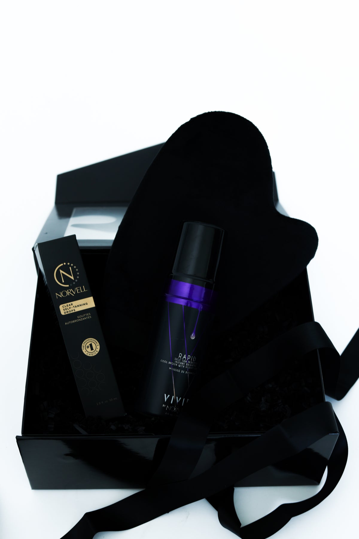 Perfect for the at home self tanning babes! Or for touch ups in-between spray tans and traveling. Holiday set includes: rapid tan self tanning mousse, clear self tanning bronzing drops for face and body and application mitt. Pictured packaging included.